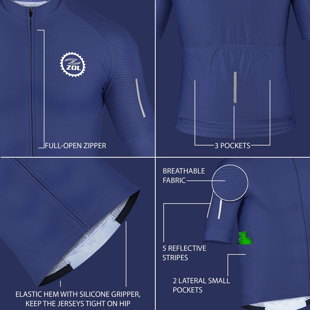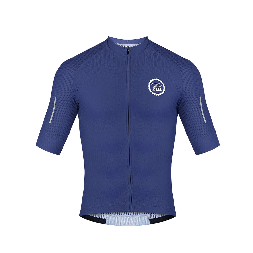 - The Zol cycling jersey is made with breathable, comfortable, and stretchy fabric that provides a tight form fit that reduces air resistance and fabric flap. The jersey has laser cut sleeves and two reflective strips on each sleeve. The zipper opens completely for ventilation during rides, and it is cut long in the back to accommodate the bent-over cycling position along with 2 lateral and 3 rear pockets, and 1 reflective strip in the back.