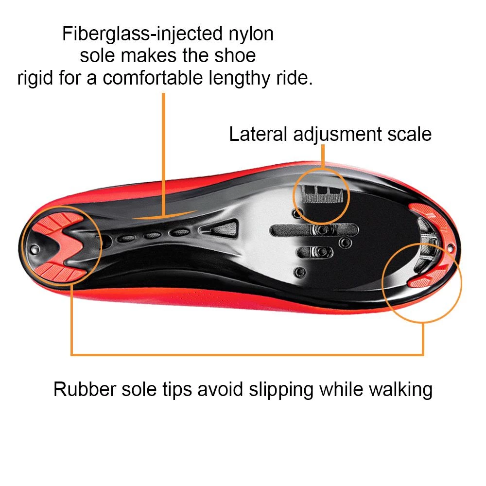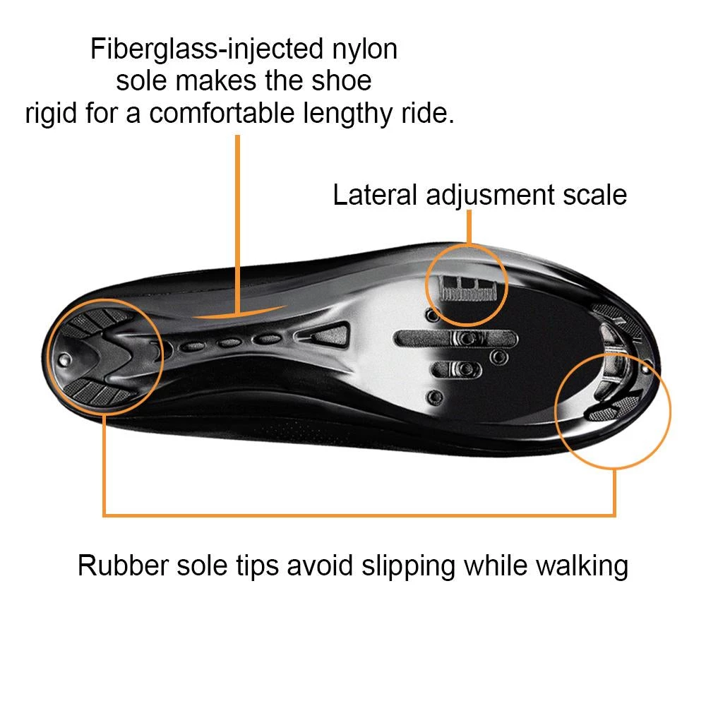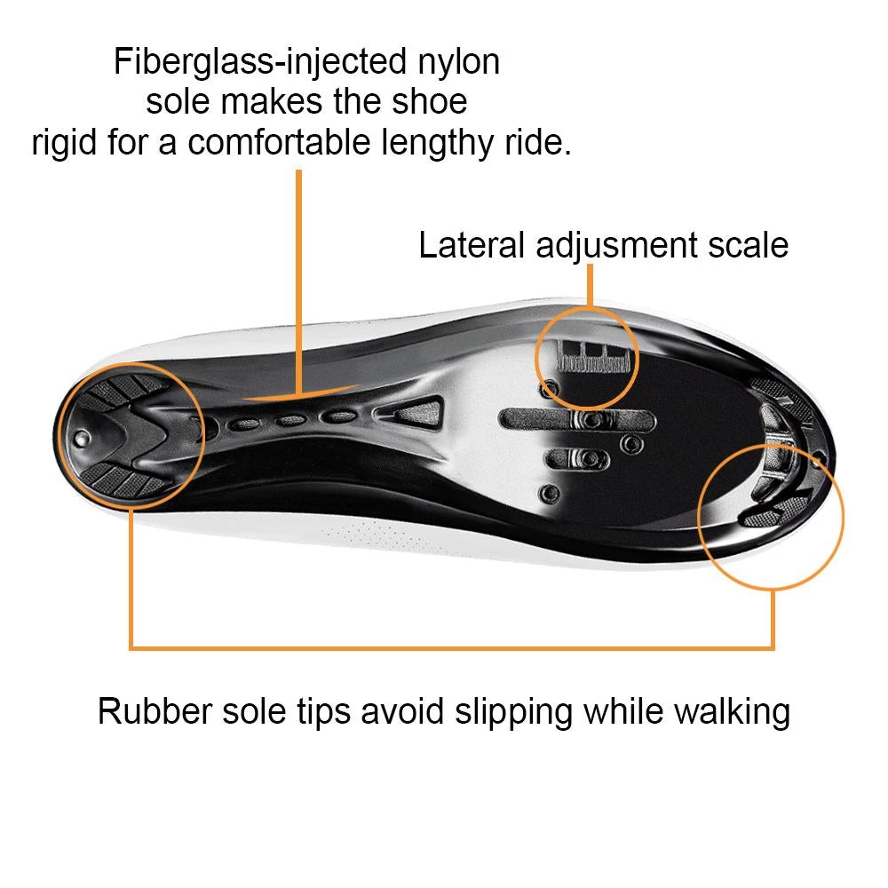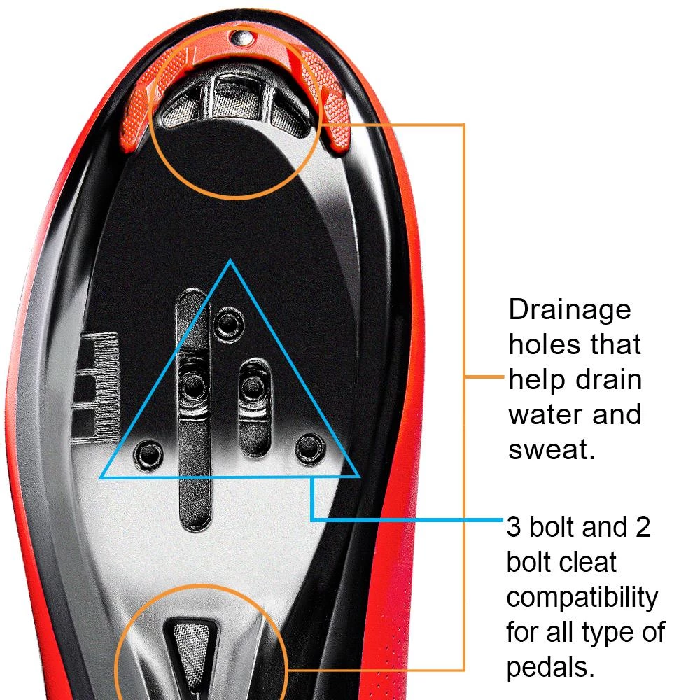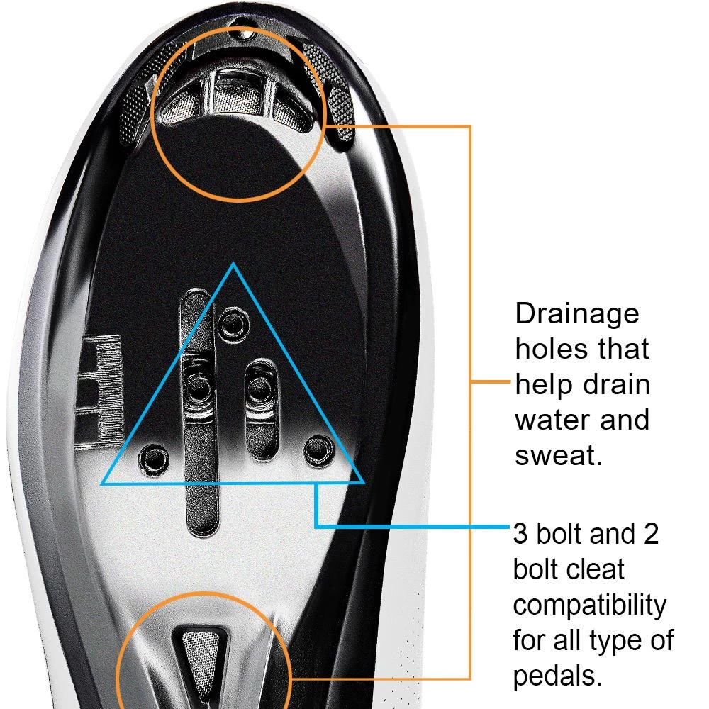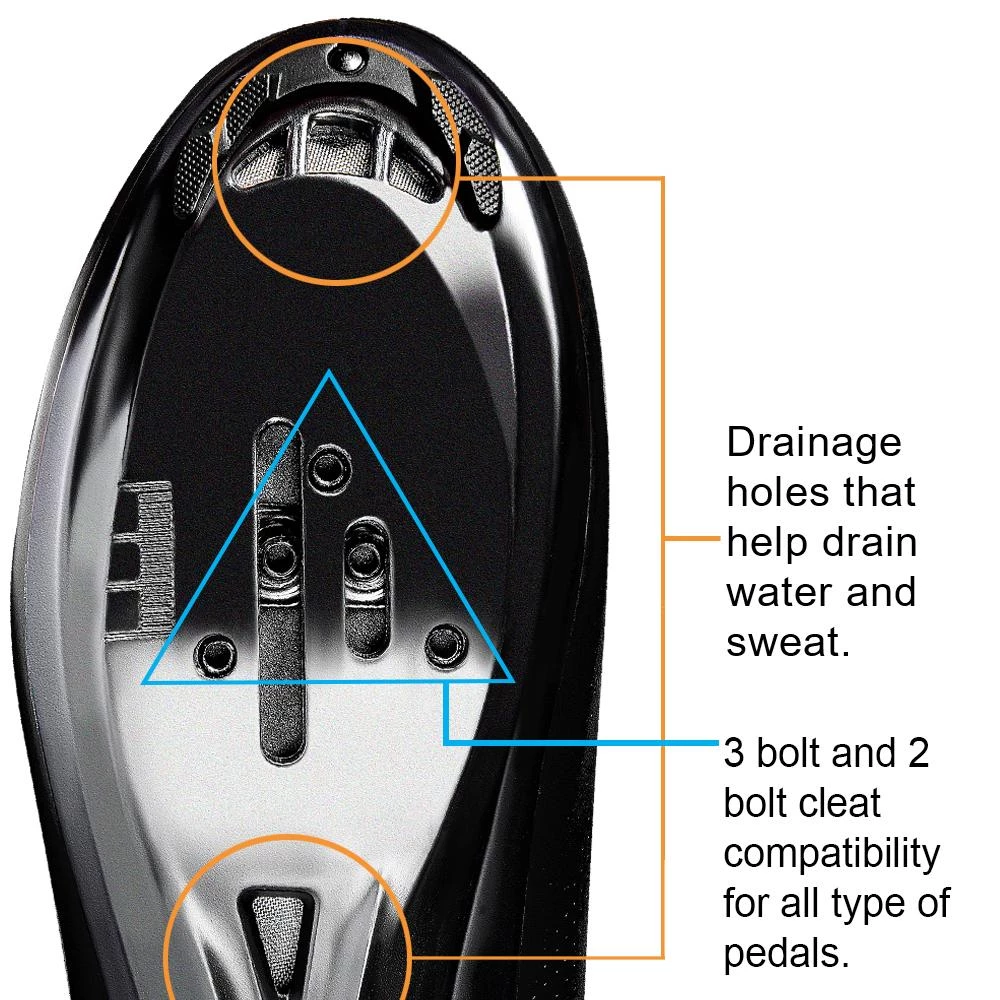 For road cycling, fitness cycling, and indoor cycling. Three (3) reflective features for safety on the road. This high-end shoe is durable and provides a comfortable enhanced fit. Made with synthetic leather and perforated holes that create a breathable shoe perfect for perspiration in any weather condition. Fiberglass-injected nylon sole makes the shoe rigid for a comfortable lengthy ride and the seven (7) drainage holes in the sole help drain water and sweat. Rubber sole tips avoid slipping while walking. A three (3) strap closures safely secure the foot and provide a firm grip while you are pedaling. Fiberglass-injected nylon sole makes the shoe rigid for a comfortable lengthy ride. Seven (7) drainage holes in the sole, and perforated insole holes help drain water and sweat. Universal 3 bolt and 2 bolt cleats compatible with all Peloton Delta, Look, Shimano SPD-SL, Shimano PD, Speedplay Road, Speedplay MTB, Time Road, Time MTB, SPD, Crank Brothers, MTB pedals and all universal pedals. One Year Warranty.