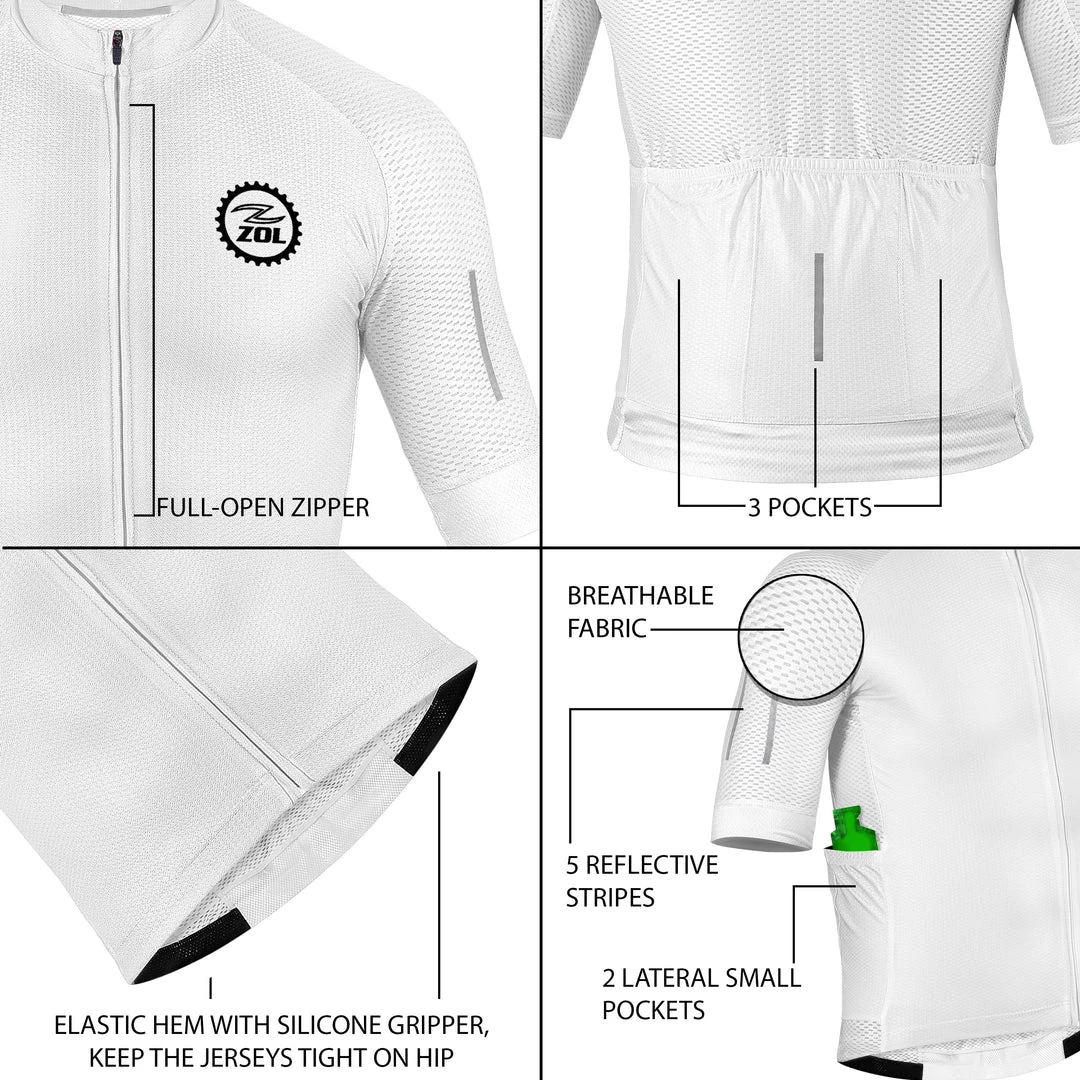- COMFORTABLE & HANDY the Zol cycling jersey is made with breathable, comfortable, and stretchy fabric that provides a tight form fit that reduces air resistance and fabric flap. The jersey has laser cut sleeves and two reflective strips on each sleeve. The zipper opens completely for ventilation during rides, and it is cut long in the back to accommodate the bent-over cycling position along with 2 lateral and 3 rear pockets, and 1 reflective strip in the back.